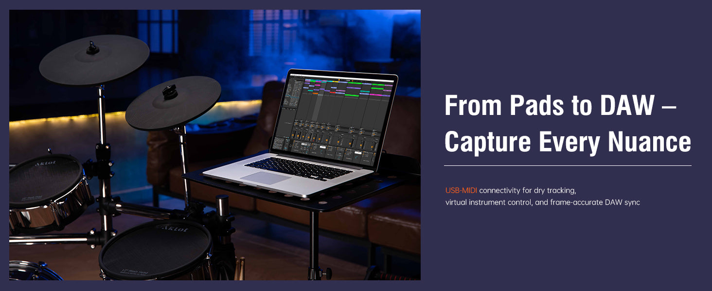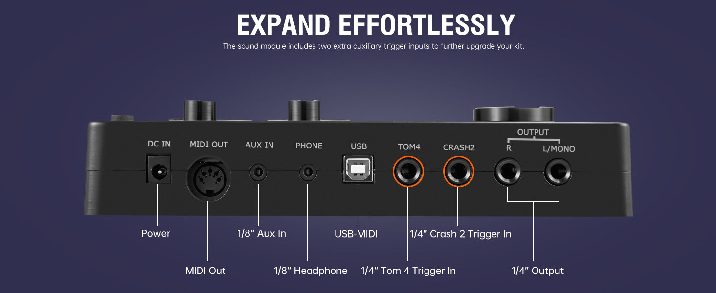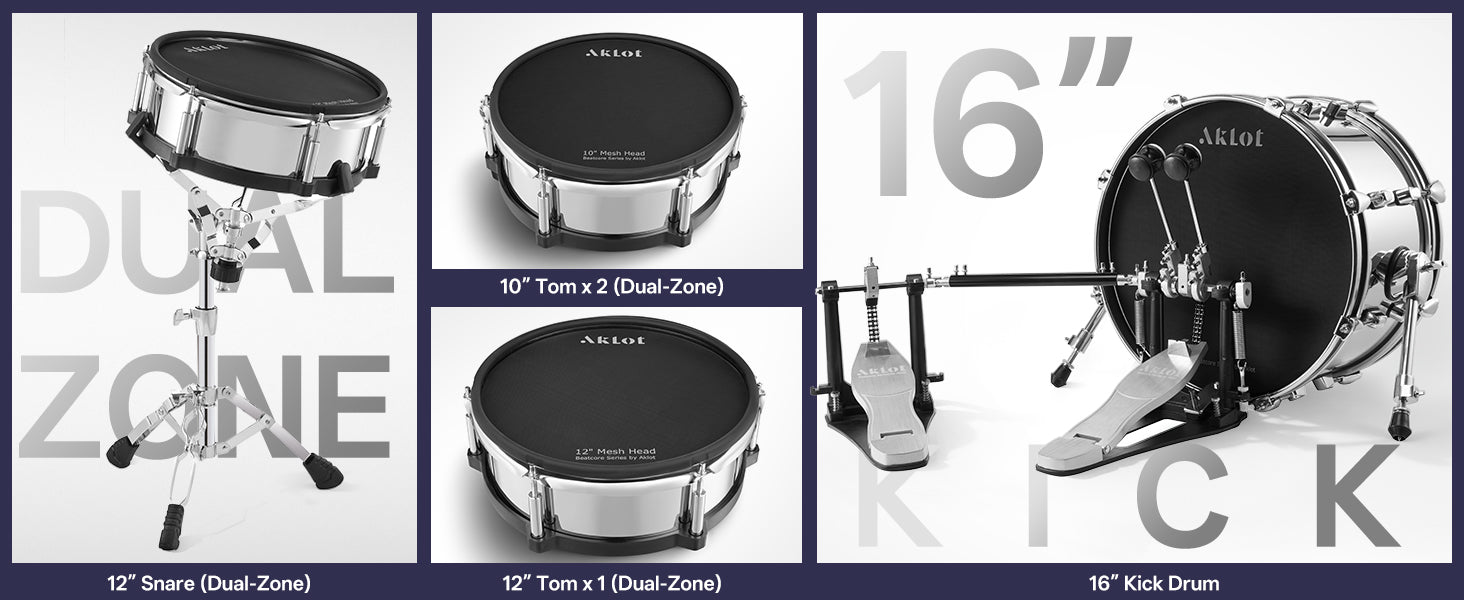 Independent Snare Replicates True Acoustic Feel: The 12" wood snare delivers authentic acoustic response with dual-zone sensitivity, capturing every playing nuance — from crisp rimshots and powerful backbeats to subtle ghost notes and delicate brush sweeps. The triple-ply mesh head with 6-point tension adjustment allows precise customization from tight punch to controlled rebound, mirroring premium acoustic snare performance.