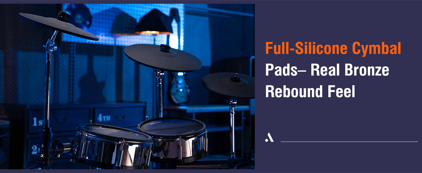 All Silicone Cymbal Collection with Pro Response: Crafted from high-density silicone compound, these professional cymbals deliver unmatched acoustic realism across every strike. The Dual-Zone Crash features precision bow/edge detection with instant choke response, while the 14'' Triple-Zone Ride (edge/bow/bell) provides seamless transitions from defined bell attacks to complex wash tones. Both cymbals boast specially textured playing surfaces that deliver 85-90% energy return for natural stick rebound, with advanced multi-sensor technology maintaining phase-accurate signal integrity.