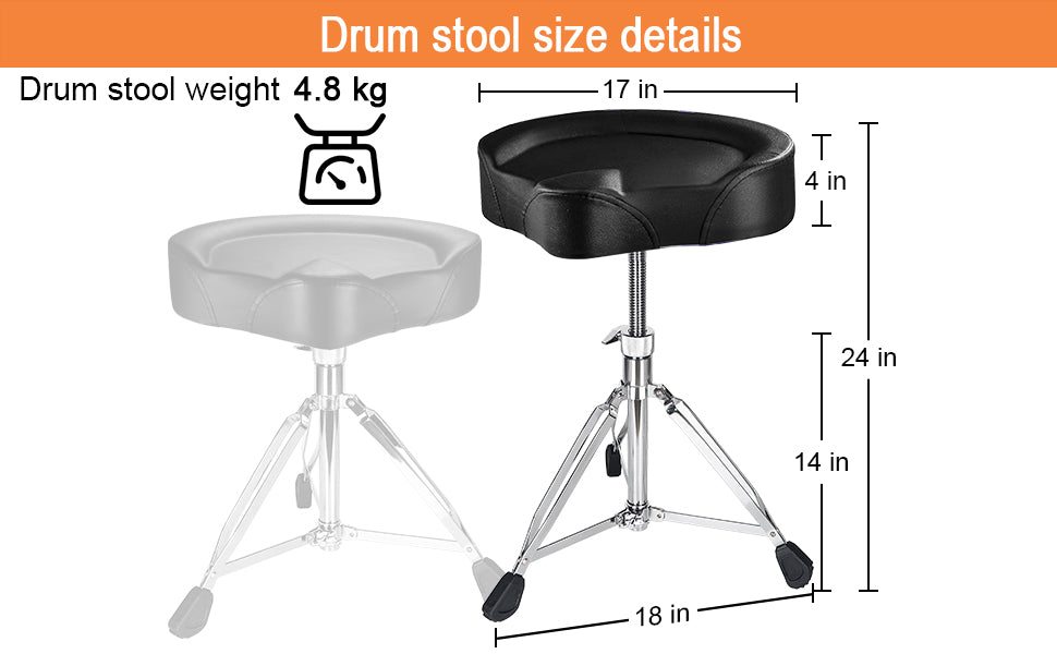 - 【Product Size]】The drum chair sponge is 9.5cm thick, 43.5cm wide and 39cm long; the height can be adjusted from 17-24 inches; the maximum range of the tripod is 22 inches; the dimensions have been precisely calculated to give you the best experience.