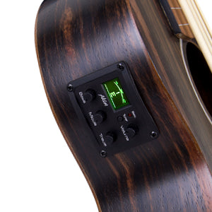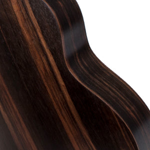 Aklot bass ukulele with striped ebony top, sides and back. The wood is shiny and has no special odor. Corrosion resistant, durable, hard and heavy material, delicate.