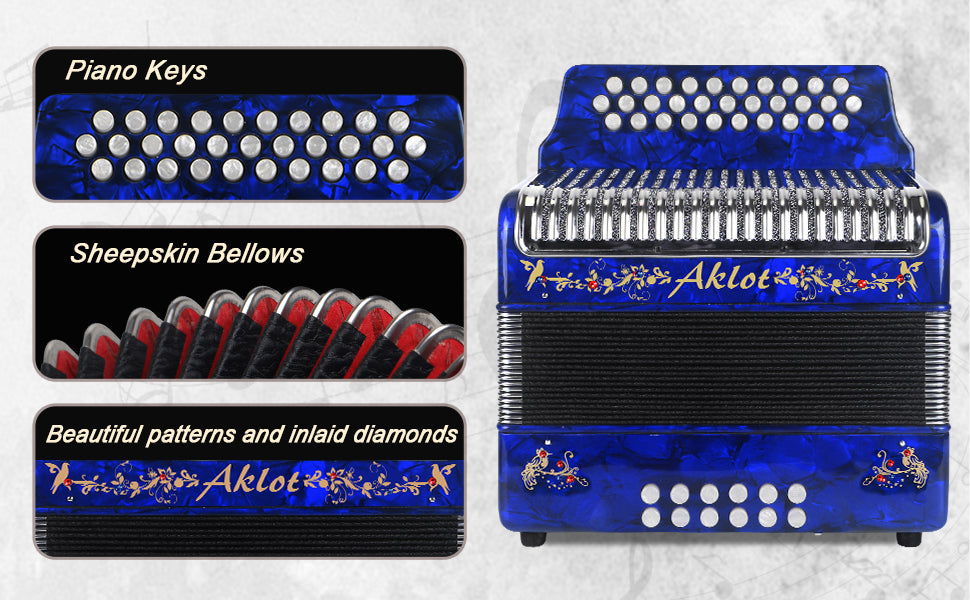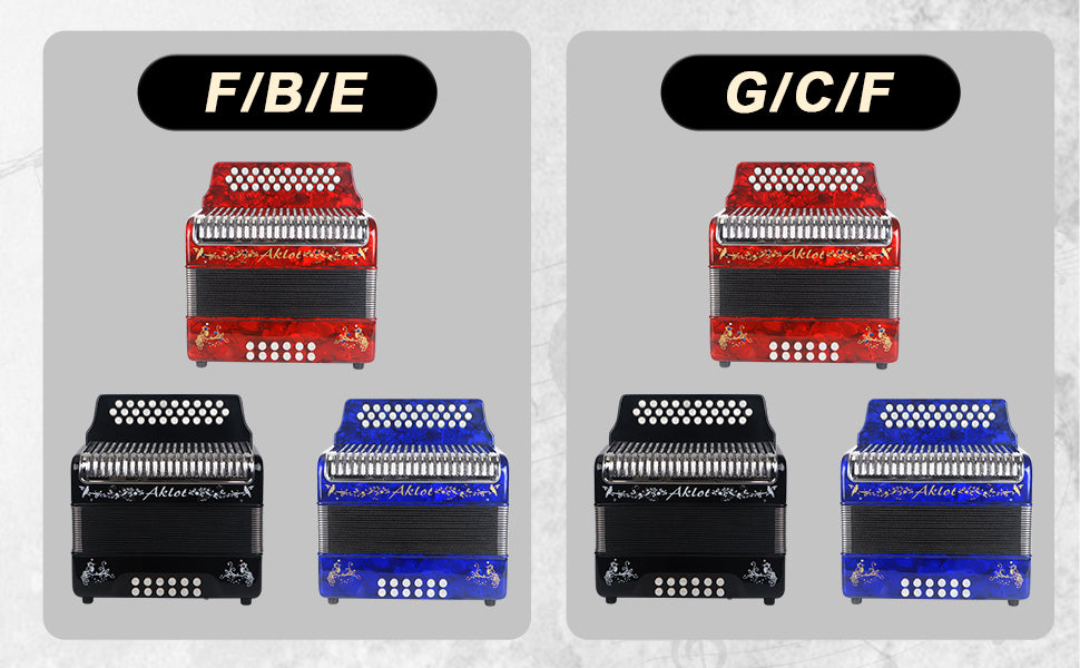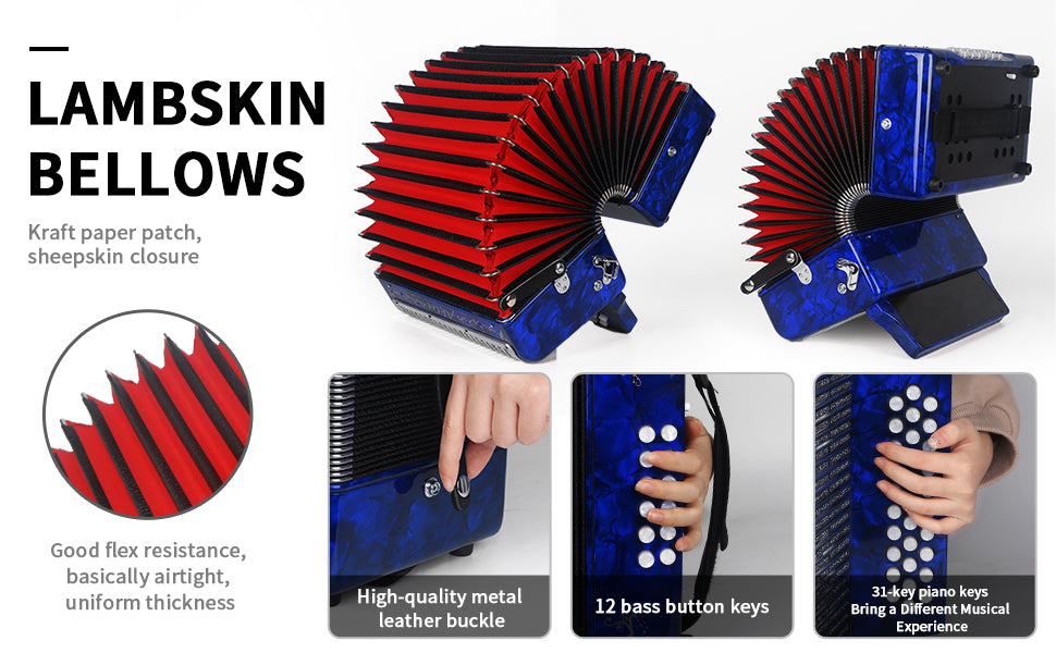 F/B/E High Quality Scale: 31-key piano treble keys and 12-key bass chord keys accordion tuning The reeds are precisely adjusted to the F/B/E tones, providing the accordion with rich, powerful tones, suitable for solo performance or as an accompaniment