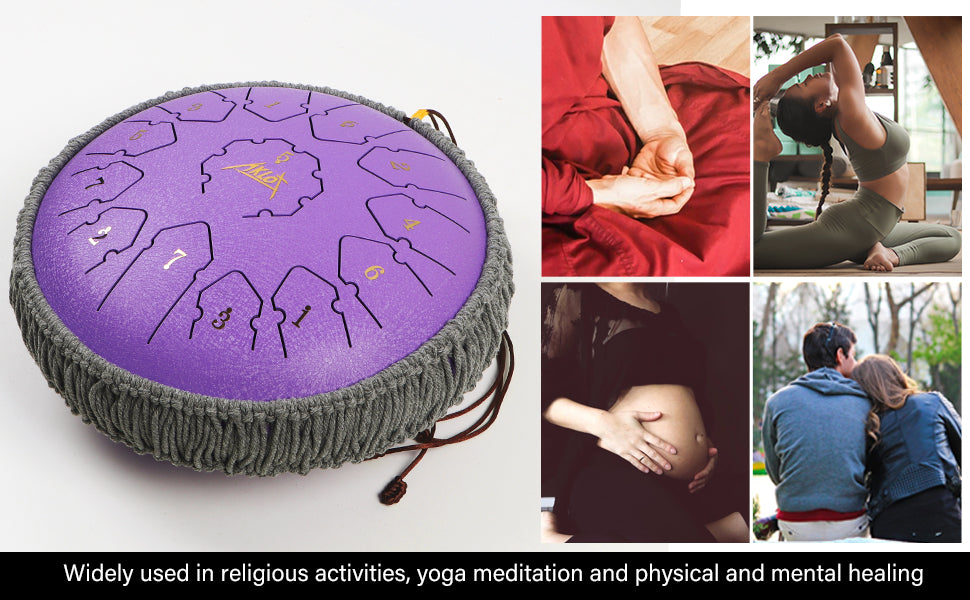- USAGE-The steel tongue drum is widely used in religious activities, yoga meditation, early childhood enlightenment and physical and mental healing.