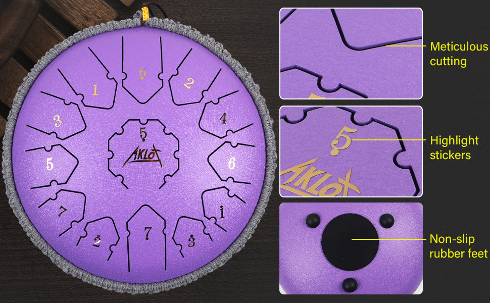 AKLOT Steel tongue drum is hand-made by professional craftsmen, they attach much importance to the meticulous cutting for accurate tone, so again, don’t tune it before you are 100% sure you can do it. The steel tongue drum comes with highlight stickers for easier playing, and non-slip rubber feet for stable support when you playing.