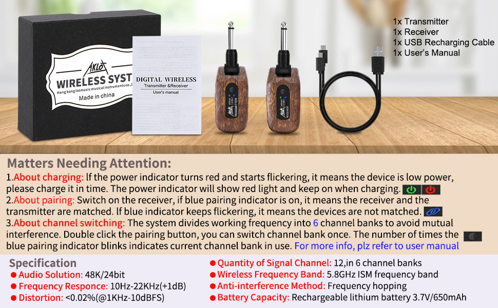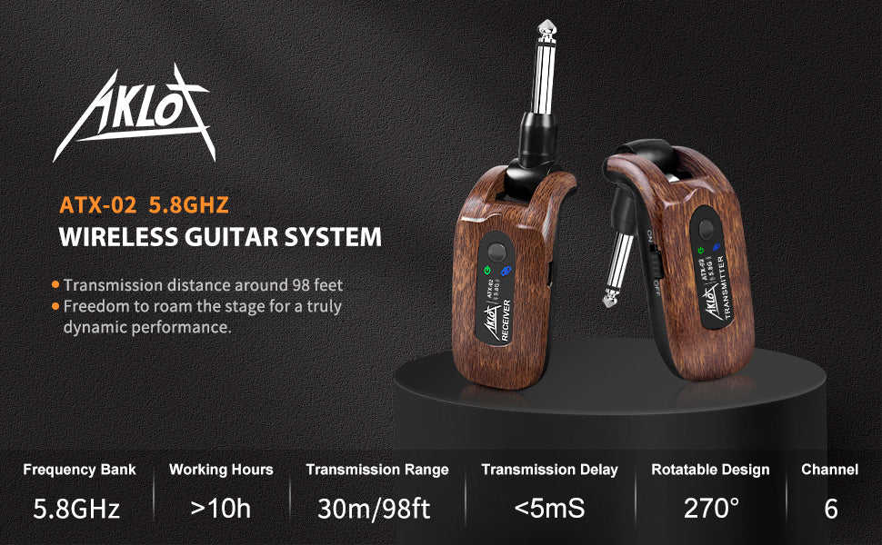 - AKLOT Wireless Guitar System supports 6 sets of devices working at same time, one-to-one and no-interference. Also, one transmitter can transmit signal to several receivers at the same time (one-to-more). 1-Key to change channel convenientely. Easy to use, plug and play.