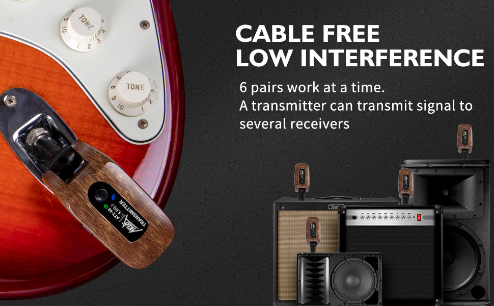 - Plug and Play : Supports 6 sets of devices working simultaneously, wireless guitar transmitter-receiver one-to-one and no-interference; and one transmitter can transmit a signal to several receivers at the same time also