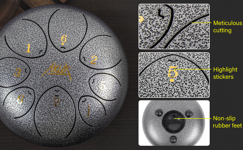 AKLOT Steel tongue drum is hand-made by professional craftsmen, they attach much importance to the meticulous cutting for accurate tone, so again, don’t tune it before you are 100% sure you can do it. The steel tongue drum comes with highlight stickers for easier playing, and non-slip rubber feet for stable support when you playing.