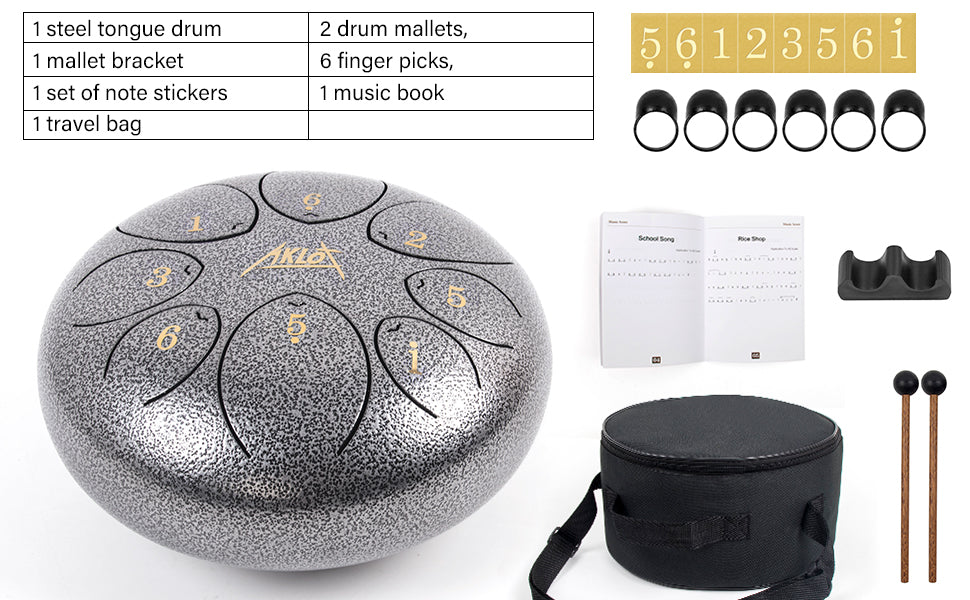 Considering to provide you a better expreience, we prepare everything that you may need to play AKLOT steel drum in the package. As the image above shown, you will get 1 steel tongue drum, 2 drum mallets, 1 mallet bracket, 6 finger picks, 1 set of note stickers, 1 music book and 1 travel bag. Having all in one, you can enjoy your steel tongue drum anytime anywhere.