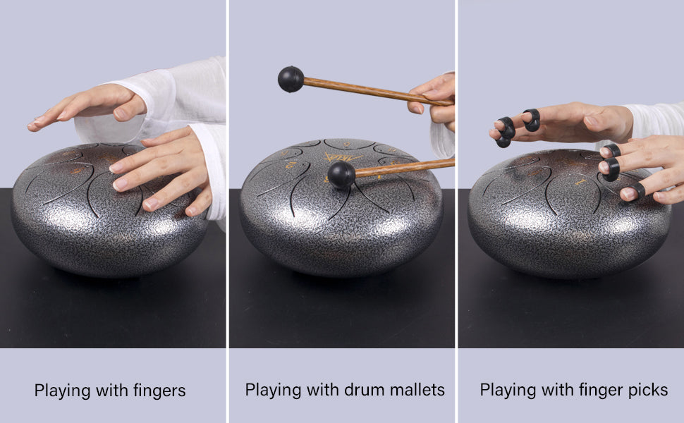 Usually there are 2 ways to play the steel drum: play by hand or play with the drum mallets. However, playing it with hands demands higher standards of hand power and more accurate tapping position, therefore, use mallets to play it will be the first recommended choice (especially for new starters). The time you are familiar with playing the steel drum, you can try to play with hand freely. And we offer 6 finger picks for you to have a better experience as well.