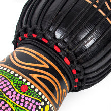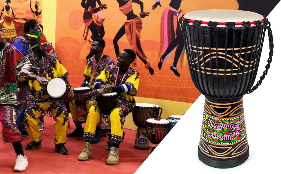 - HAND-CARVED DESIGN: The base section of djembe drum with hand-carved flying elephant pattern and other tradditonal element, a symbol of luck and best wish for you, adds unique style to your place and let you enjoy the exotic charm.