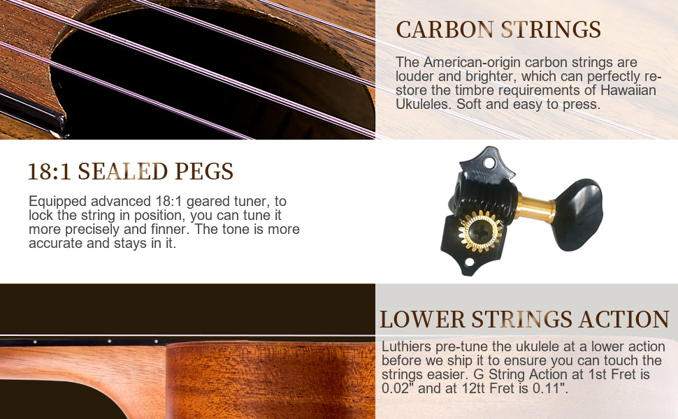 Coming with the 18:1 sealed gear tuner machine and well-known brand strings made in the US, the ukulele keeps in tune well when properly tuned. We pre-tuned every ukulele before shipping out to ensure the strings stretch out properly and stay in tune better upon arrival.