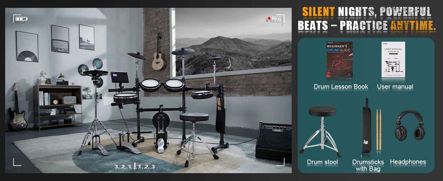 All Triple-Layer Mesh Drum Pads: Experience the perfect balance of acoustic realism and electronic convenience with 10" dual-zone mesh snare and 8’’ tom pads. The Triple-layer mesh drum heads deliver incredibly natural stick response and rebound, while the innovative removable mute ring system lets you instantly switch between full dynamic expression and ultra-quiet practice. Tune each drum to your exact preference with the precision tension system, from tight, snappy jazz settings to deep, resonant rock tones.
