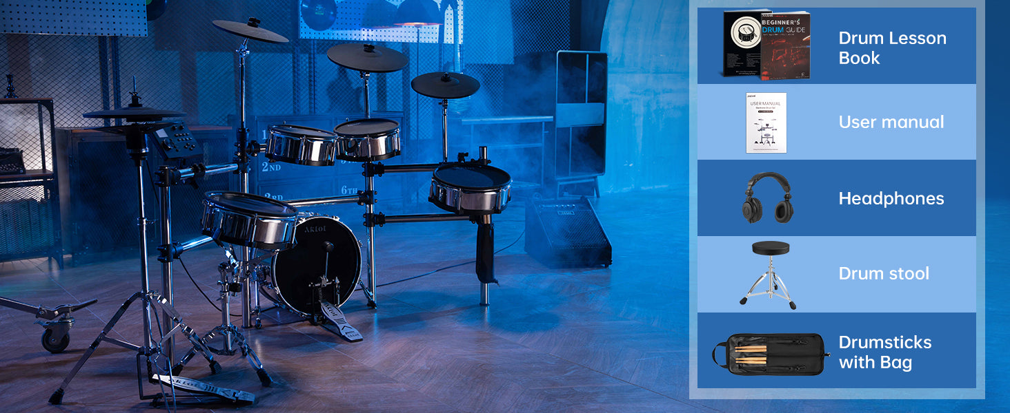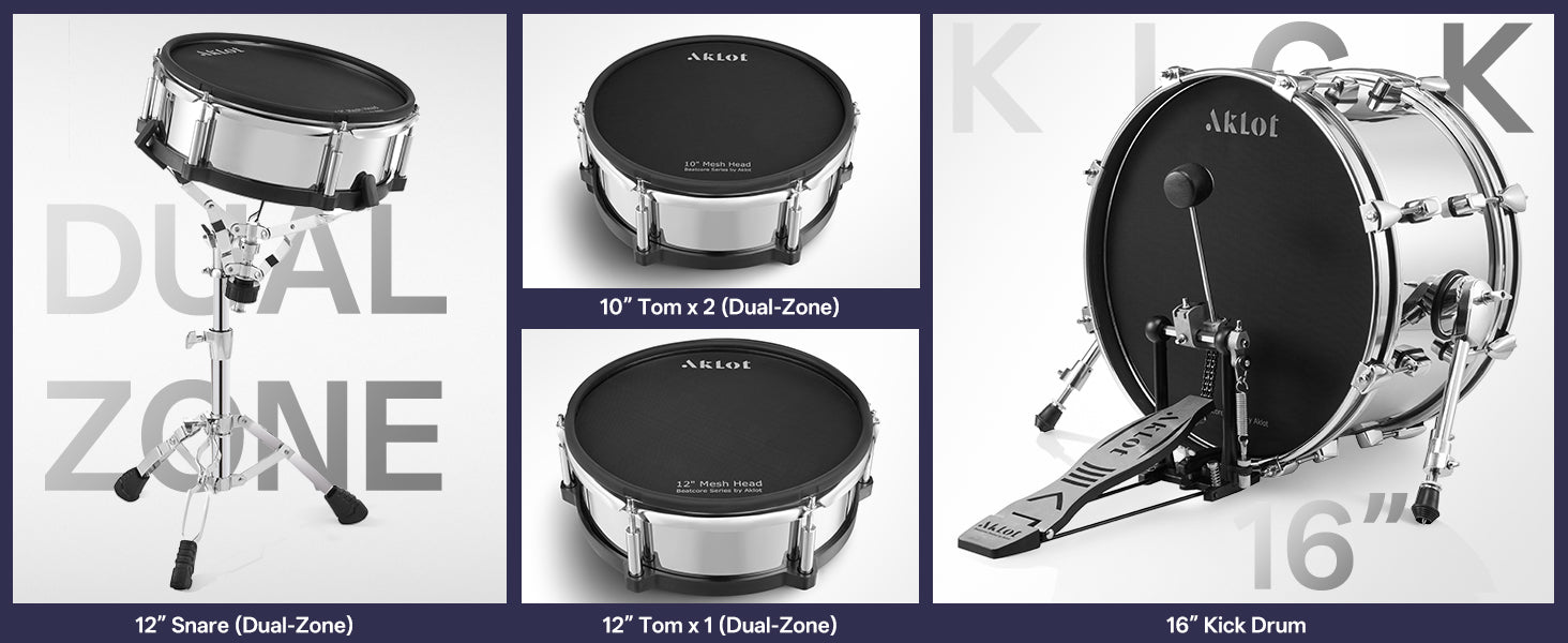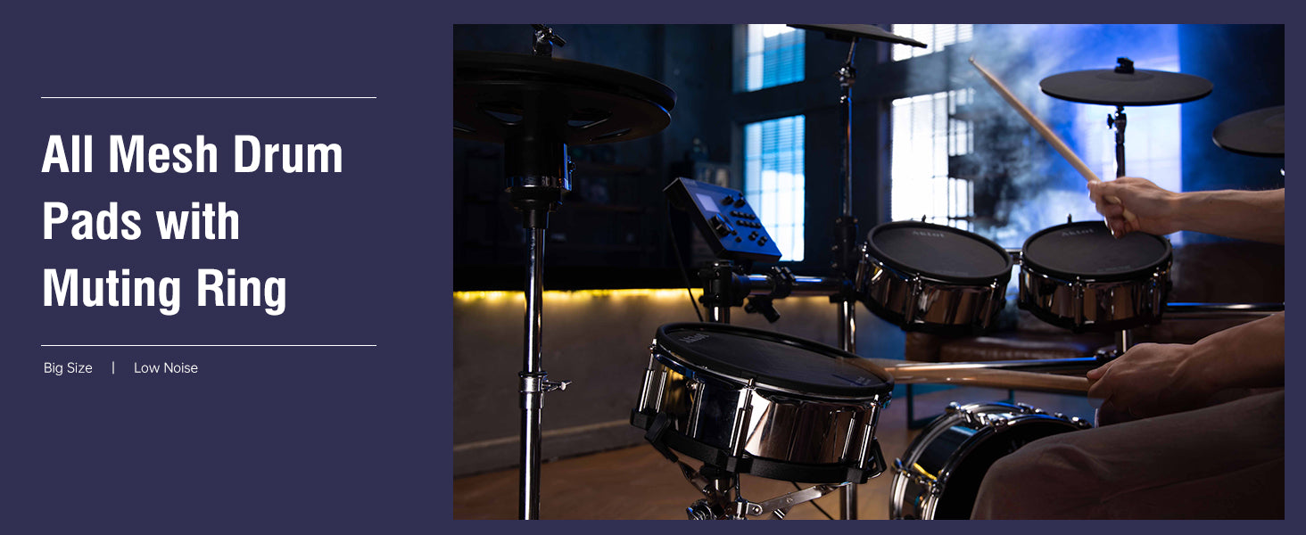 Triple-Ply Mesh Tom Drums with Acoustic Response: All drum pads feature triple-layer mesh heads that deliver acoustic-like rebound and response, with dual-zone triggering for accurate head and rim detection. The tension-adjustable design allows customized feel from tight to loose settings, while removable muting rings enable instant switching between full resonance (for live play) and 80% noise-reduced mode (for silent practice).