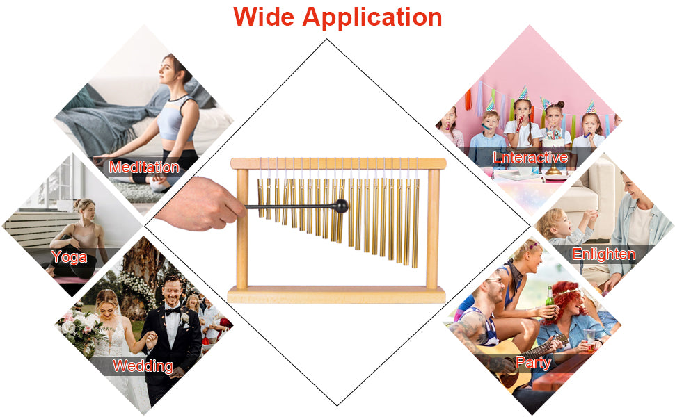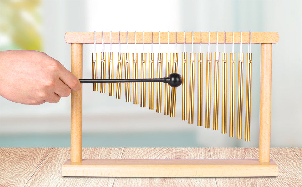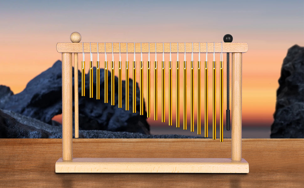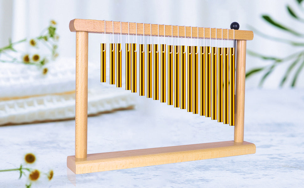 The sound tube is made of high quality metal materials, and the sound is clear and beautiful. This 20 note chimes could be used at anytime you feel stressful.Thanks to the excellent wood base, the wind chimes can stand firmly on the table to play healing melodies. The mallet that strikes the wind chimes can also be placed in the wooden base of the wind chimes for easy mastery.