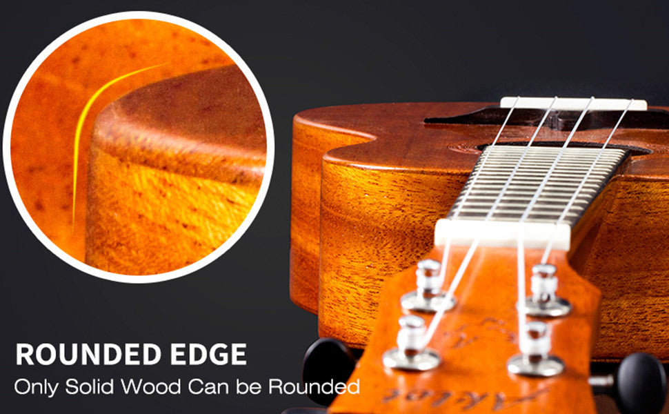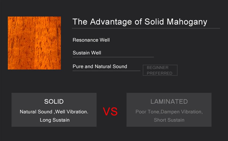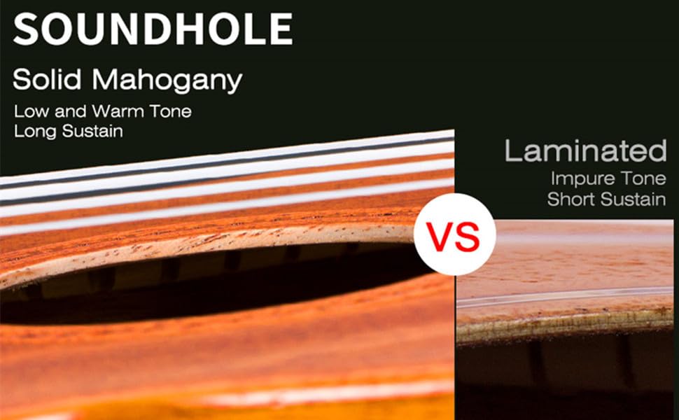 【Solid Wood Soundboard】Under the same condition, compared with Laminated wood ukulele, natural solid mahogany wood is more natural and compact , which can offer the ukulele better sustain, more stable sound and pure tone, also achieve better resonance.