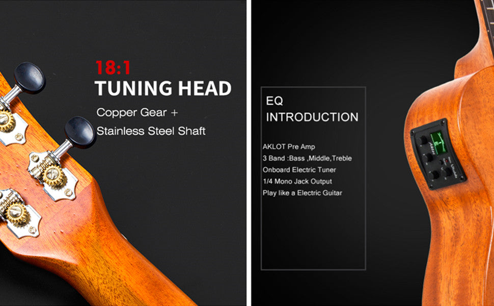 【Installed EQ】3 bands pre-amp makes you have a feeling to play it like an electric guitar, and electric tuner is installed. NOTE: Plz use a MONO audio cable to connect the uke with amp. For the instruction of how to use the Equalizer, plz check the video uploaded.