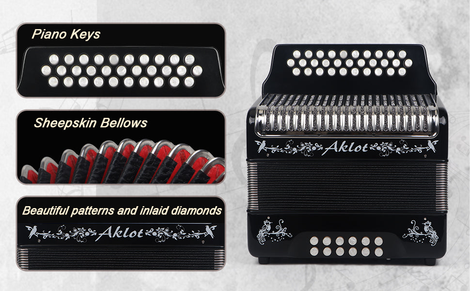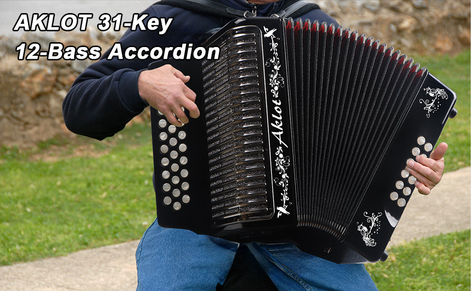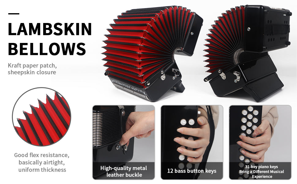 G/C/F High Quality Scale: 31-key piano treble keys and 12-key bass chord keys accordion tuning The reeds are precisely adjusted to the G/C/F tones, providing the accordion with rich, powerful tones, suitable for solo performance or as an accompaniment
