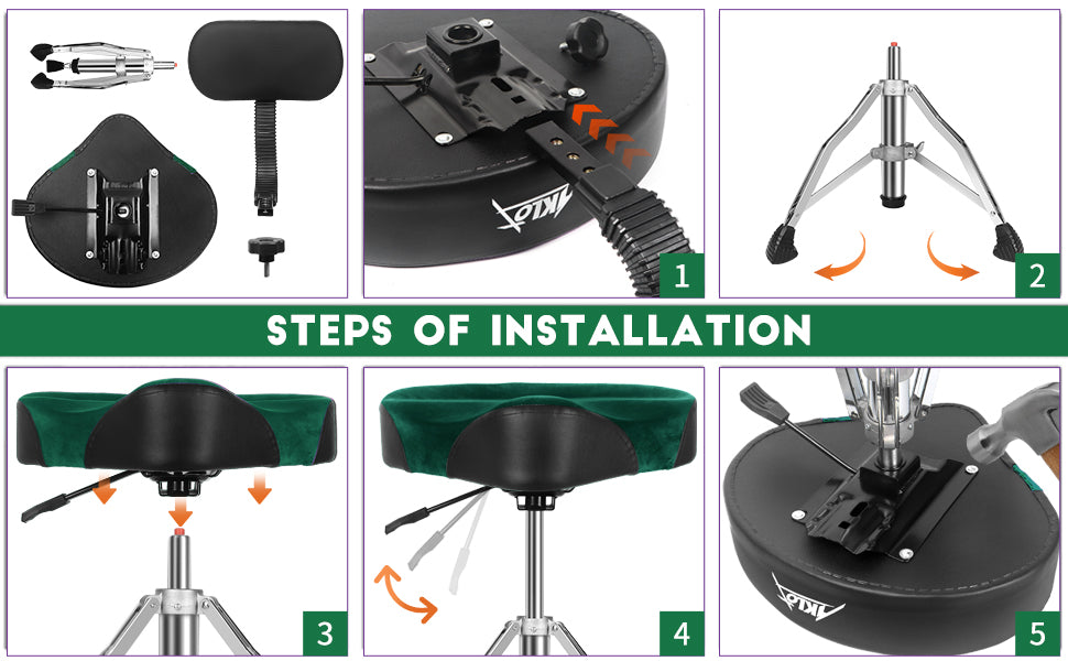 1. Connect the backrest to the drum stool and tighten it with the knob.