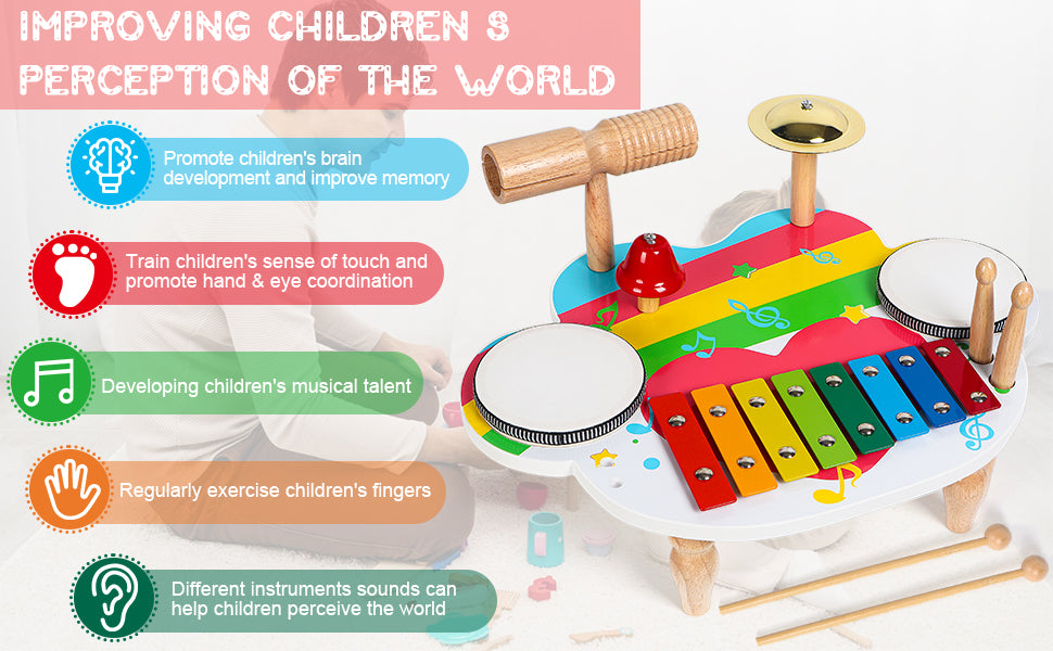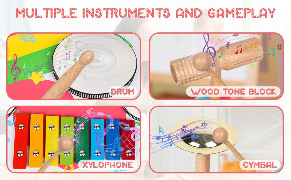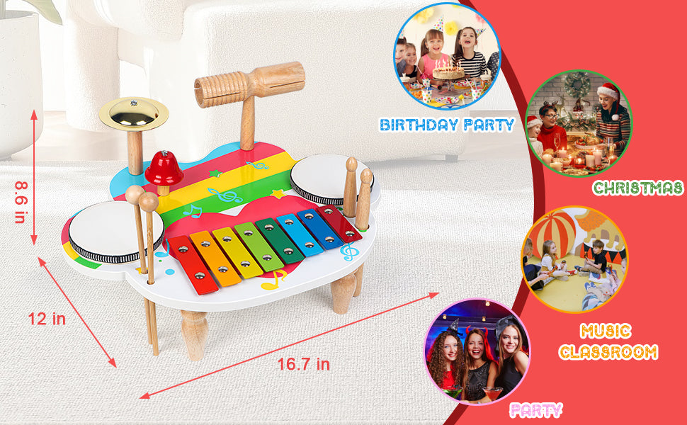 【6 IN ONE MUSICAL KIT】 : This 16.7*12*8.6 inches wooden musical table has 5 percussion instruments including a cymbal, a bell,a wood tone block ,a xylophone.2 pcs hand drum, 2 wooden drumsticks,2 drum mallet. Aklot owns its design patent.