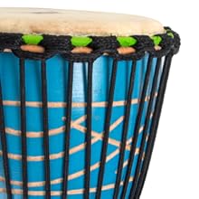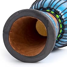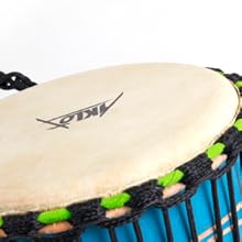 - GENUINE GOATSKIN DRUMHEAD: The jembe drum with a genuine goatskin drum head, the thinner skins have a sharper sound with fewer overtones in the slaps and are louder compared to thicker cowhide. The skin is tightened by steel rings correctly, you don’t have to worry any curved on the head.