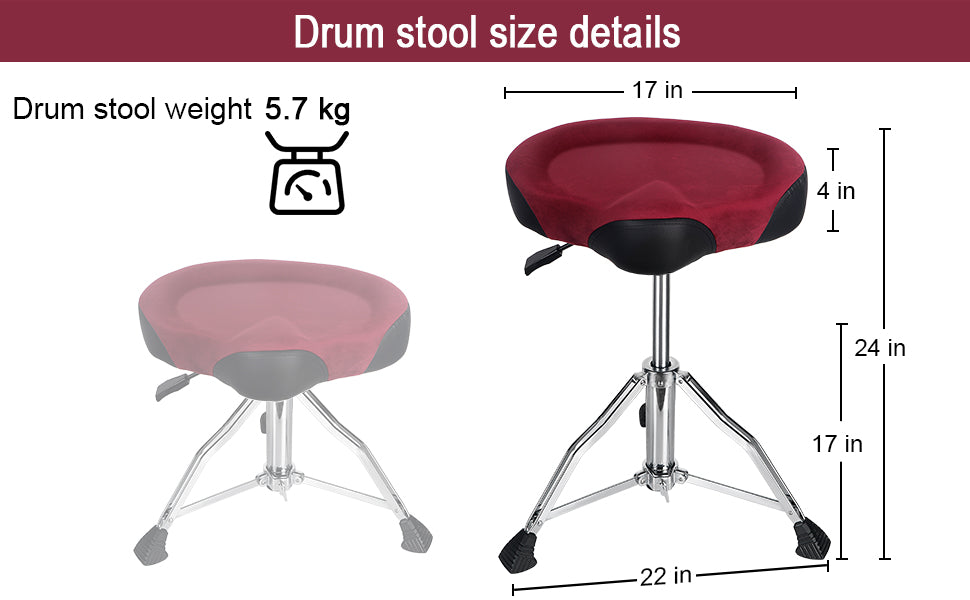 - [Product Size] The drum chair sponge is 9.5 cm thick, 43.5 cm wide and 39 cm long; the backrest is 13.2 in long and 7 in wide, with three holes to adjust the backrest and seat width; the height can be adjusted between 17-24 inches; the maximum range of the tripod is 22 inches; the size is precisely calculated to provide you with the best experience.