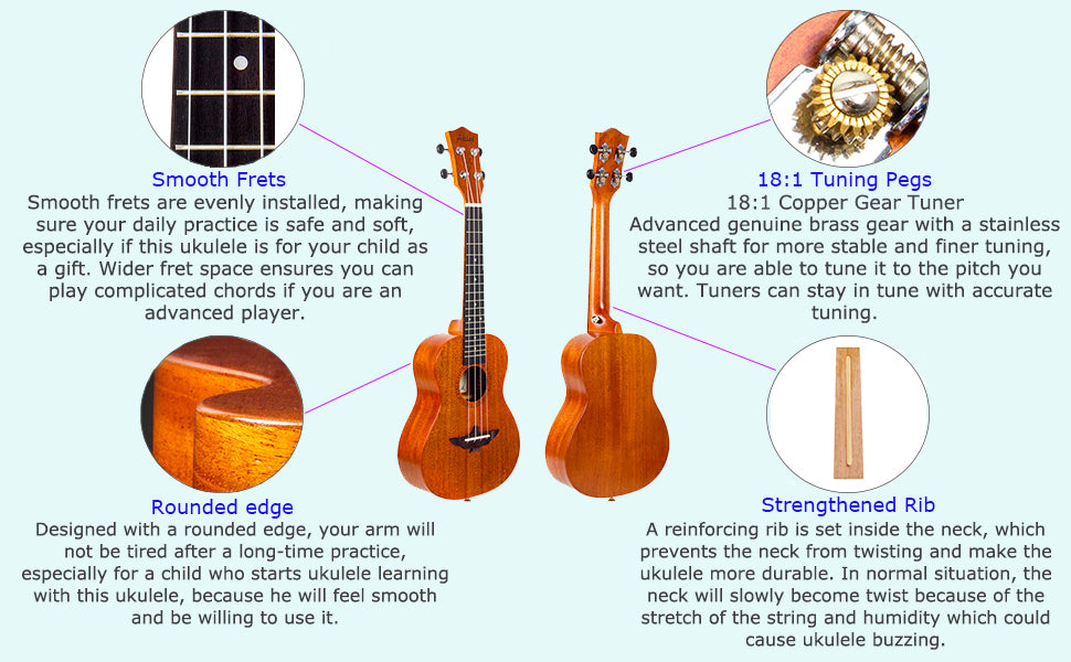 【Super Ukulele】Lower action allows you playing easily without buzzing, special fret wire avoids scratching, Aquila strings creates a full sound, strengthened neck and soundboard ensures quality and durability of this uke.